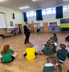 A local MP meeting and answering questions from our children.