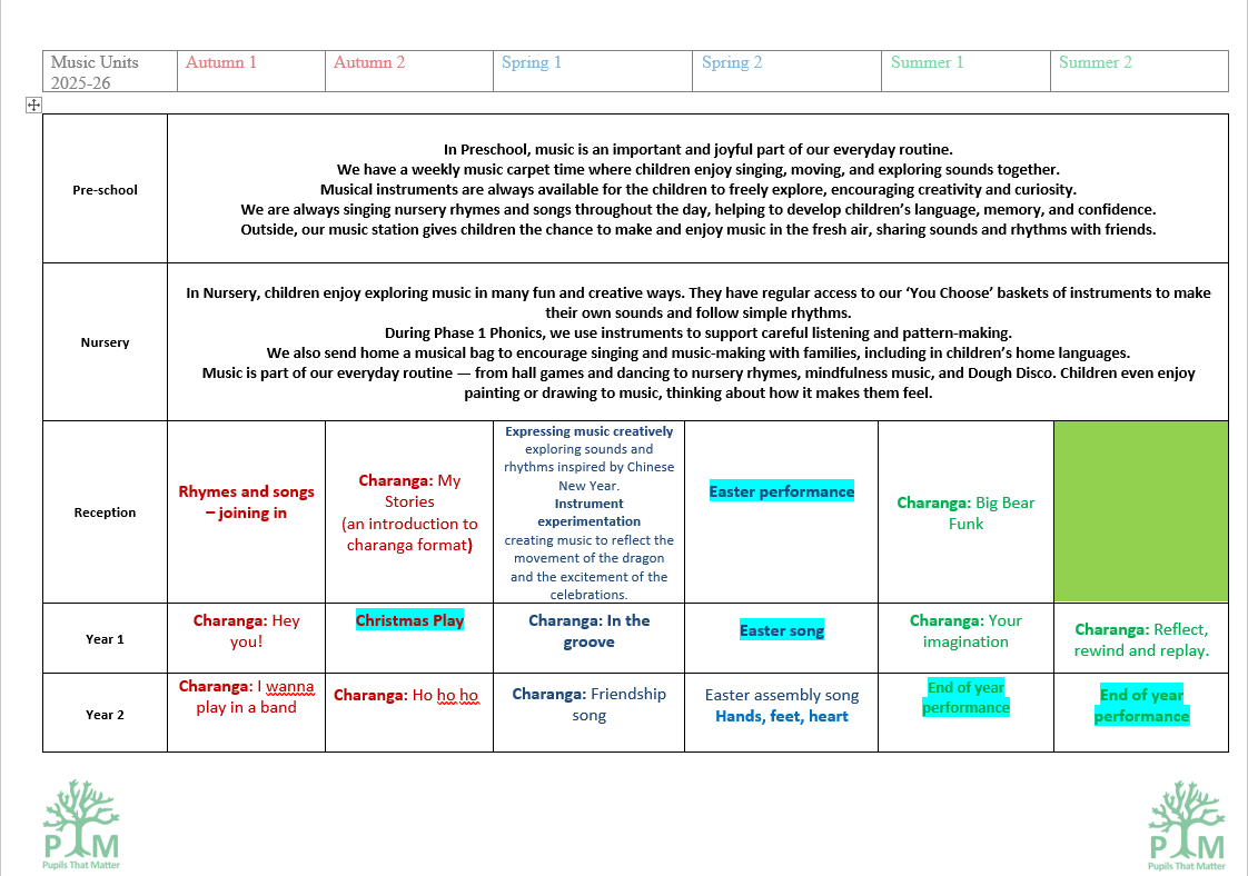 In essence: Music at Pear Tree Mead is taught through joyful, hands-on learning that nurtures every child’s ability, creativity, and confidence — ensuring inclusion, equality of access, and personal growth for all pupils.
